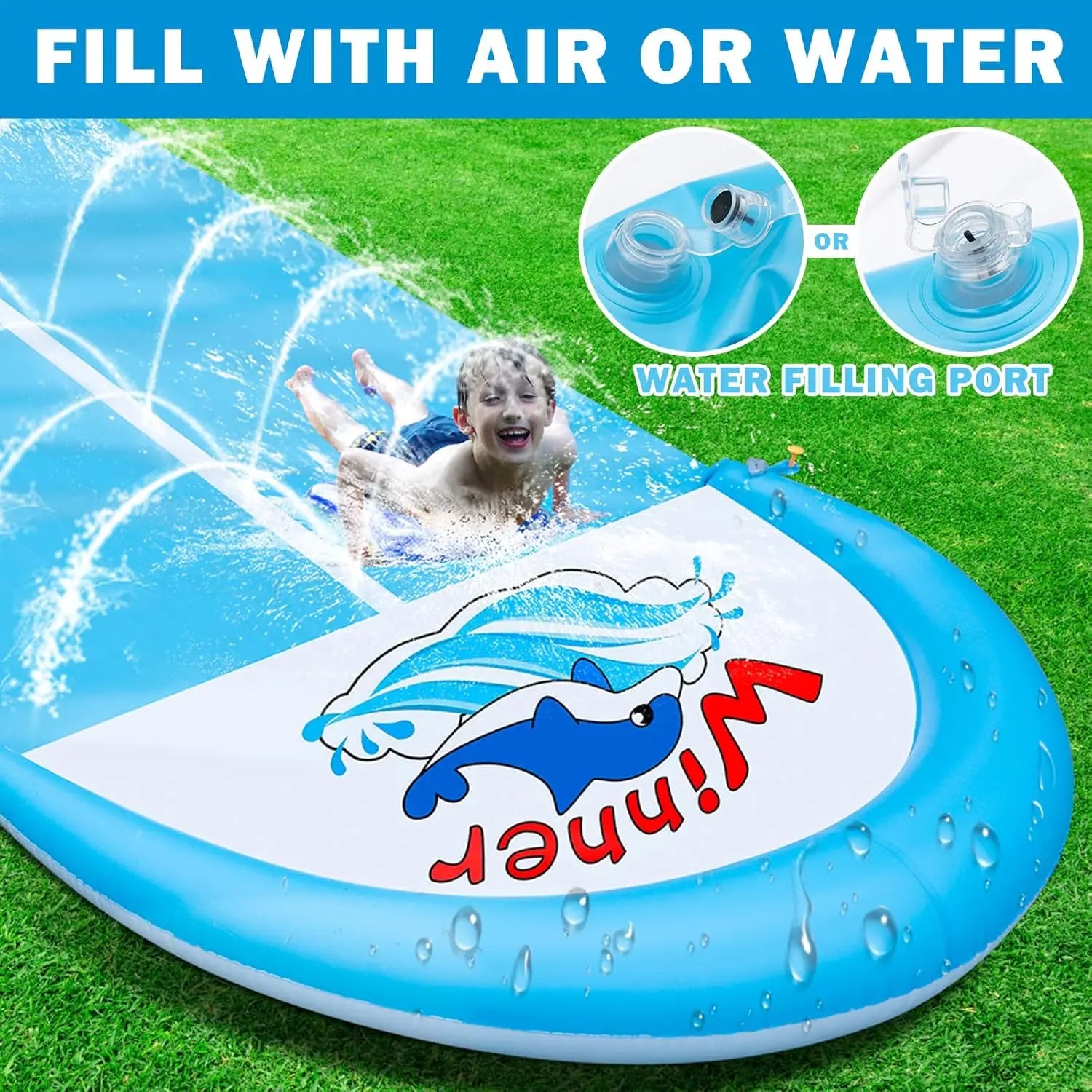 【CHILD-SAFE】Safety is always a top priority when it comes to children's toys. Our lawn water slide for kids backyard has been thoroughly tested and certified for child safety, so parents can have peace of mind knowing that their children are safe while playing. NOTE: Be very careful to clear the ground below the slide of any rocks, sticks, or anything else that could puncture the vinyl.