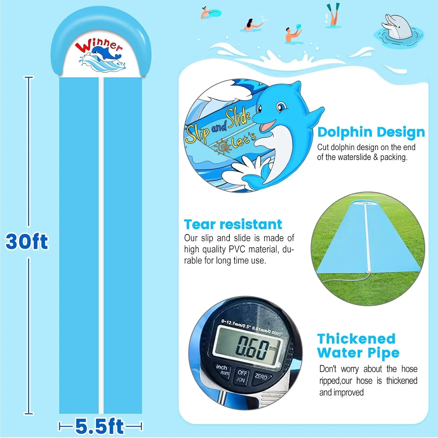 【30ft EXTRA LONG LAWN WATER SLIDE】 Our slide is 30ft extra long, 5.5 ft wide and made with 0.6mm thick PVC material which provides durability and sturdiness. This ensures that children can enjoy hours of sliding without the risk of tearing or damaging the slide.