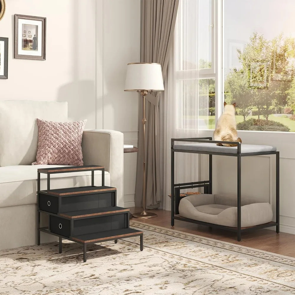 This dog window perch is designed to encourage interaction and alleviate pet anxiety by providing a comfortable spot near a window with a view. It allows pets to watch the outdoors and anticipate your return, reducing boredom and separation anxiety while keeping them engaged. The product features a removable 4-step pet stair with a lower step height for ease of access, making it suitable for older, smaller, or less mobile pets, including those with hip dysplasia. The stairs are covered in textured carpet for secure footing and comfort and can be used as a standalone step system. The window perch includes a 360° swivel feeder with a spring switch mechanism and four height adjustments, along with two 6.7" stainless steel bowls for convenient eating and drinking. Its smart design offers a cozy top sleeping space with a cushion and a versatile bottom area, which can be used as a second pet sleeping nook or for toy storage, allowing two pets to enjoy the space at the same time. The stairs also include two spacious storage drawers. Constructed with a sturdy metal frame and high-quality wood grain engineered board, the dog window perch is built for lasting stability and can support pets up to 60 lbs. Its beautiful wood finish design complements most home decors, allowing it to blend seamlessly into any room, making it a great addition next to beds, couches, or chairs.