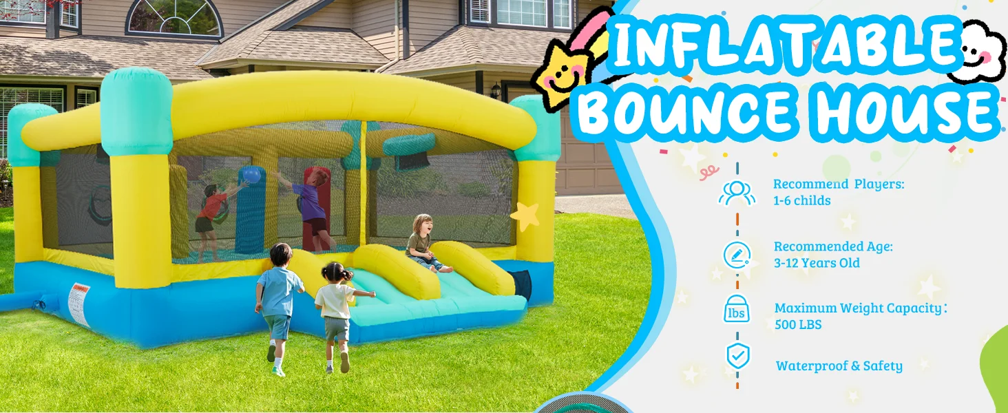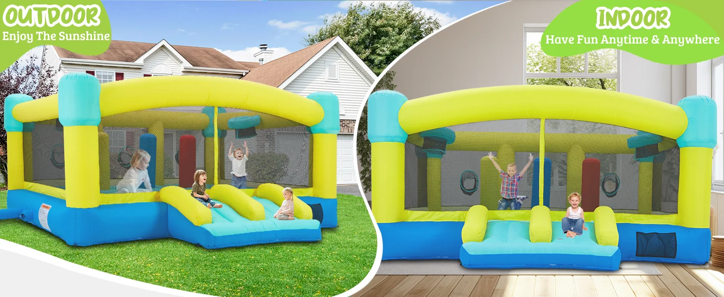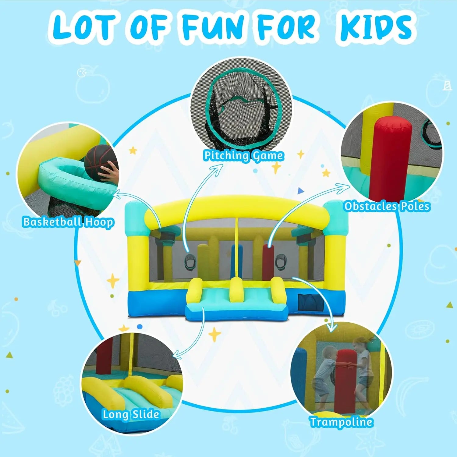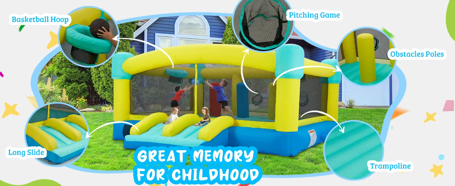 1. 【Rich Gameplay】The children's bounce house combines many popular game areas, including mysterious obstacle poles, long slides, inflatable trampolines, basketball hoops, and throwing nets. Children can bounce, slide, and throw freely, experiencing different joys. The unique design and brightly colored shape of the bounce castle will provide hours of family fun.