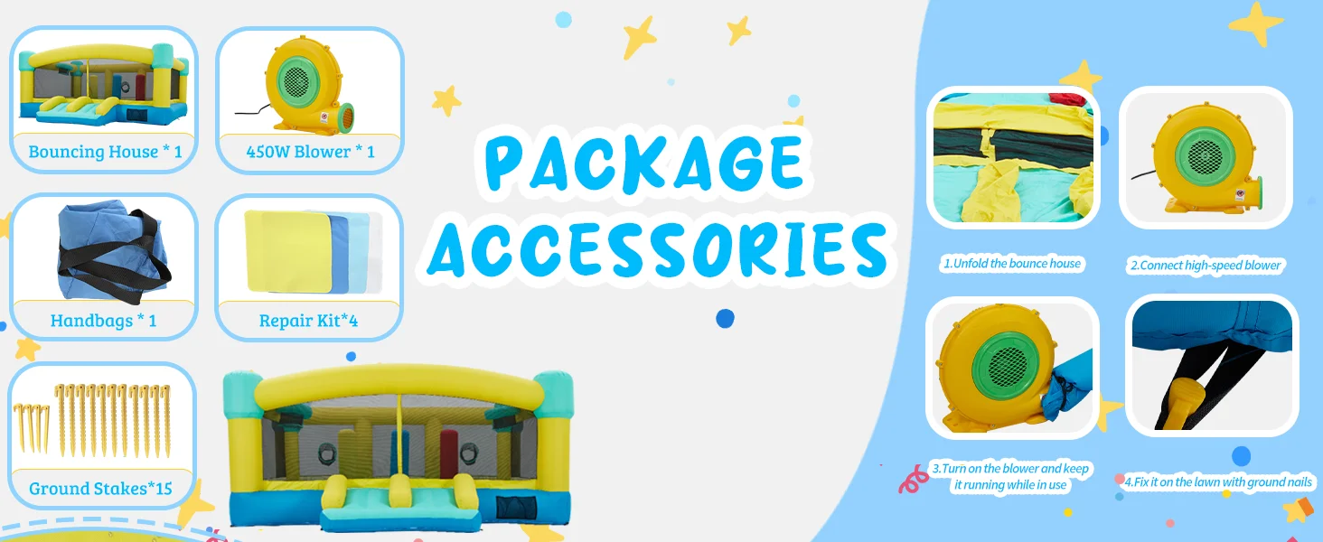 5. 【Complete Accessories】1*bounce house, 1*550W blower, 1*storage bag (convenient for storage and transportation), 11*plastic piles, 4*blower piles, 4*repair patches and 1*user manual.