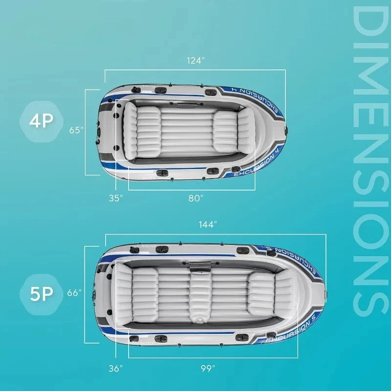 SPACIOUS – With an inflated size of 10'4" x 5'5" x 1'5" and a maximum weight capacity of 1100 pounds, the Excursion 4 blow up boat is large enough to sit four adults comfortably.