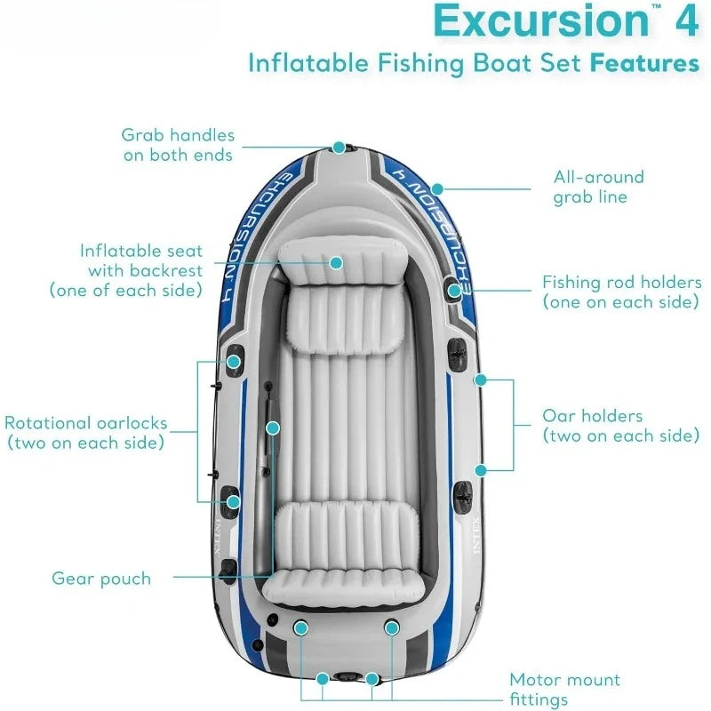 68324EP Excursion 4 Inflatable Boat Set: Includes Deluxe 54in Boat Oars and High-Output Pump – Adjustable Seats with Backrest – Fishing Rod Holders – 4-Person – 1100lb Weight Capacity
