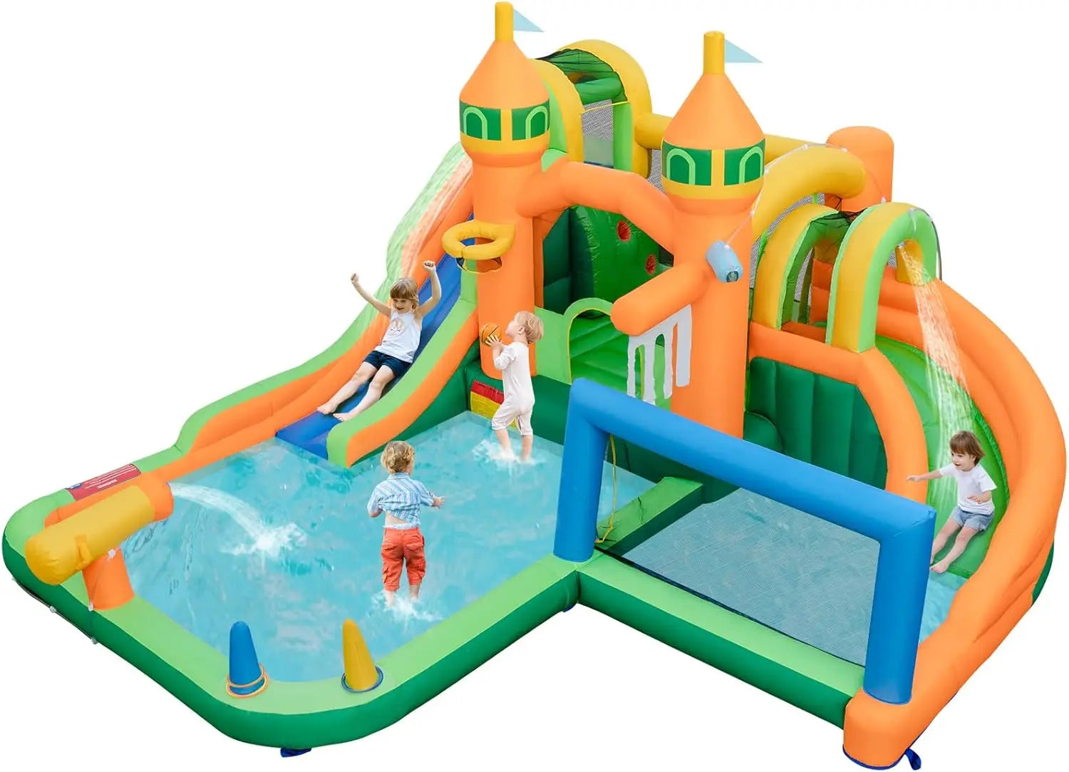 【Multiple Play Areas for More Fun】: Designed to entertained multiple children at the same time, this inflatable water slide offers 9 different activity areas, including 2 water pools, basketball hoop, hook game, football gate, bounce area, water spray gun, climbing wall, long slide and turning slide. With all these fun activities, this play set not only provides endless fun, but also enhances children\u2019s hand-eye coordination, balance and motor skills.