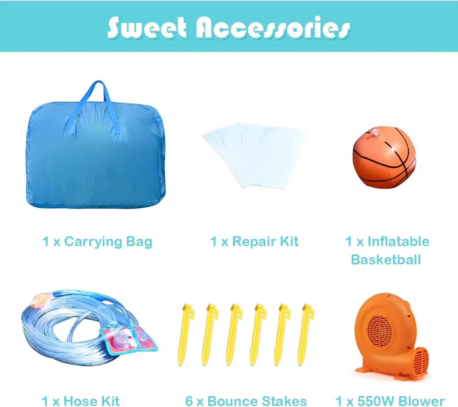 【Bonus Accessories & Tips】The package includes an inflatable bounce house, a 550W air blower, a carrying bag, 1 repair kit, 1 water hose, 1 basketball and 6 ground stakes. 1. The product needs a constant supply of air from the blower (which inevitably produces some noise). It is normal that some air comes from the fabric surface and seams.