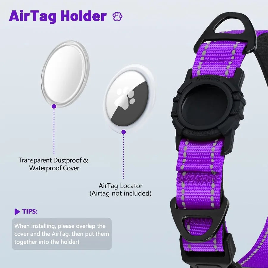 Reflective AirTag Dog Collar with Airtag Holder Dual DRings Safety Locking Buckle Durable Adjustable Soft Padded for Medium Dog