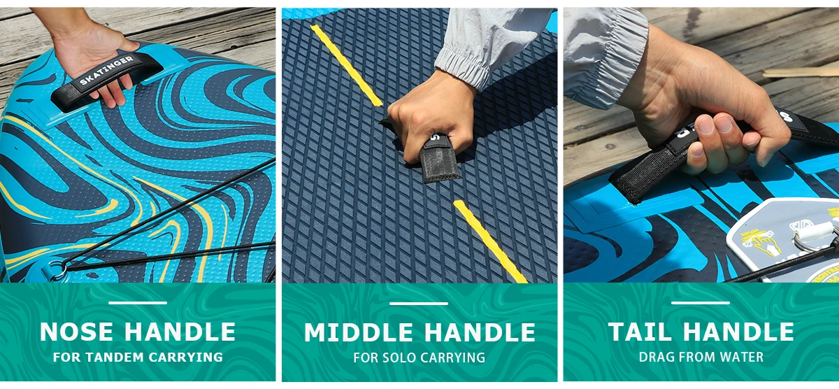 Crafted from durable PVC, this SKATINGER paddle board offers a robust yet lightweight design for easy inflation and storage.