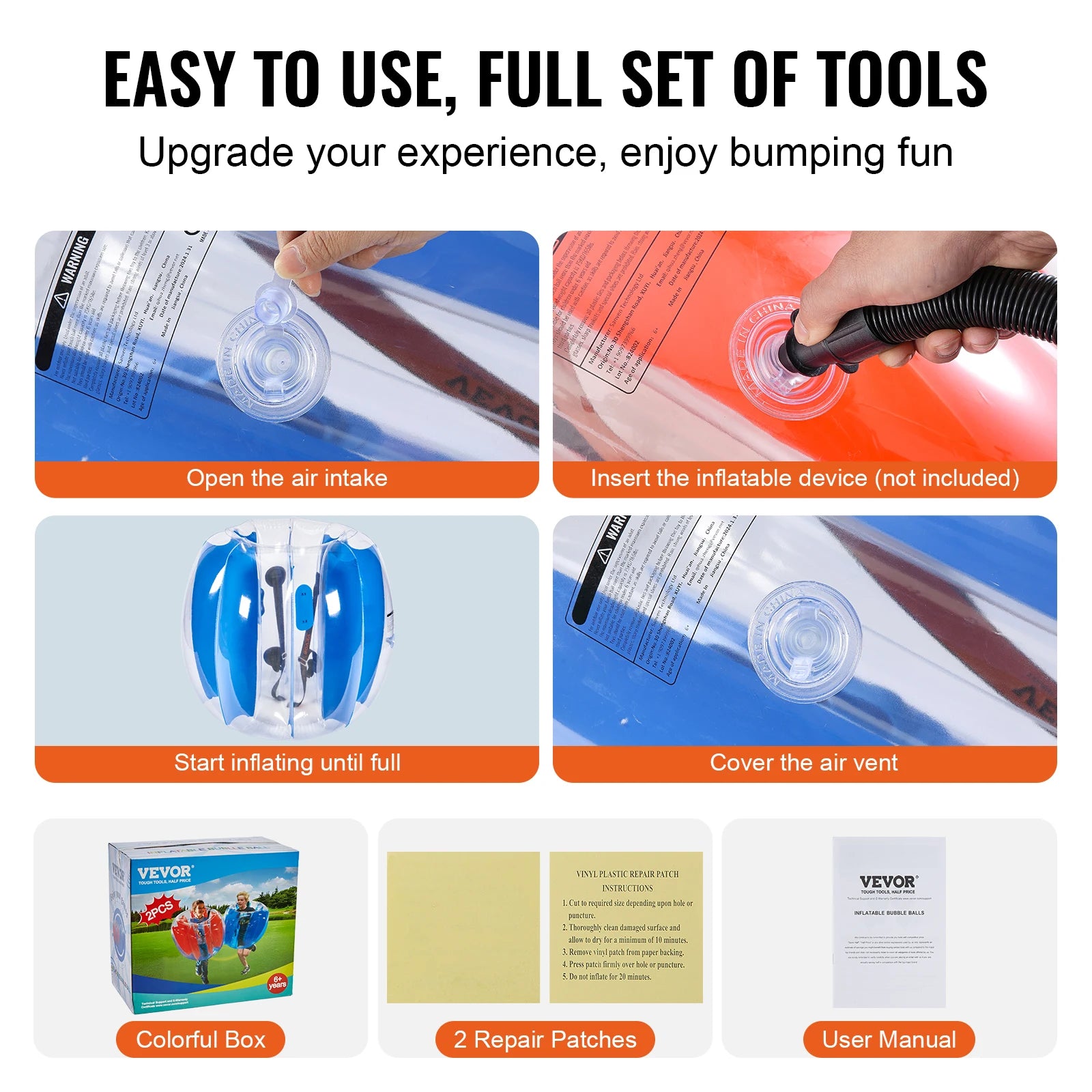 • High-quality Material, Endless Fun: Dive into endless bumping fun with VEVOR 2PCS Inflatable Bumper Balls! Crafted from 0.3mm thick, explosion-proof PVC, these sumo balls are durable, safe, waterproof, and built to prevent air leaks. Excellent tear resistance, advanced valve system and tight sealing promise long-lasting entertainment.